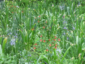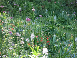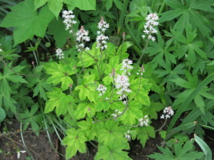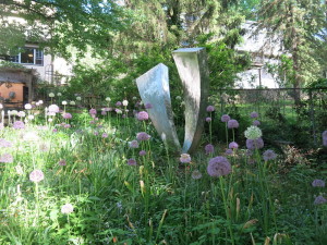 In the checkerboard garden, overhead conditions have changed as the neighbor’s cedar has grown quite mighty. All the shade it now provides means the creeping phlox no longer thrives. Instead, moss has moved in and columbines have self-seeded extensively along with forget-me-nots. I’m debating if I should see how this plays out next year or if I ought to include something to carry this area from spring into summer this Fall. Perhaps the shorter, clumping allium like A. millenium which blooms in summer? A single clump in the center of each mossy green square would look fetching but I wonder if the paucity of sunlight would once again be a problem. Another investigation to add to my growing list.