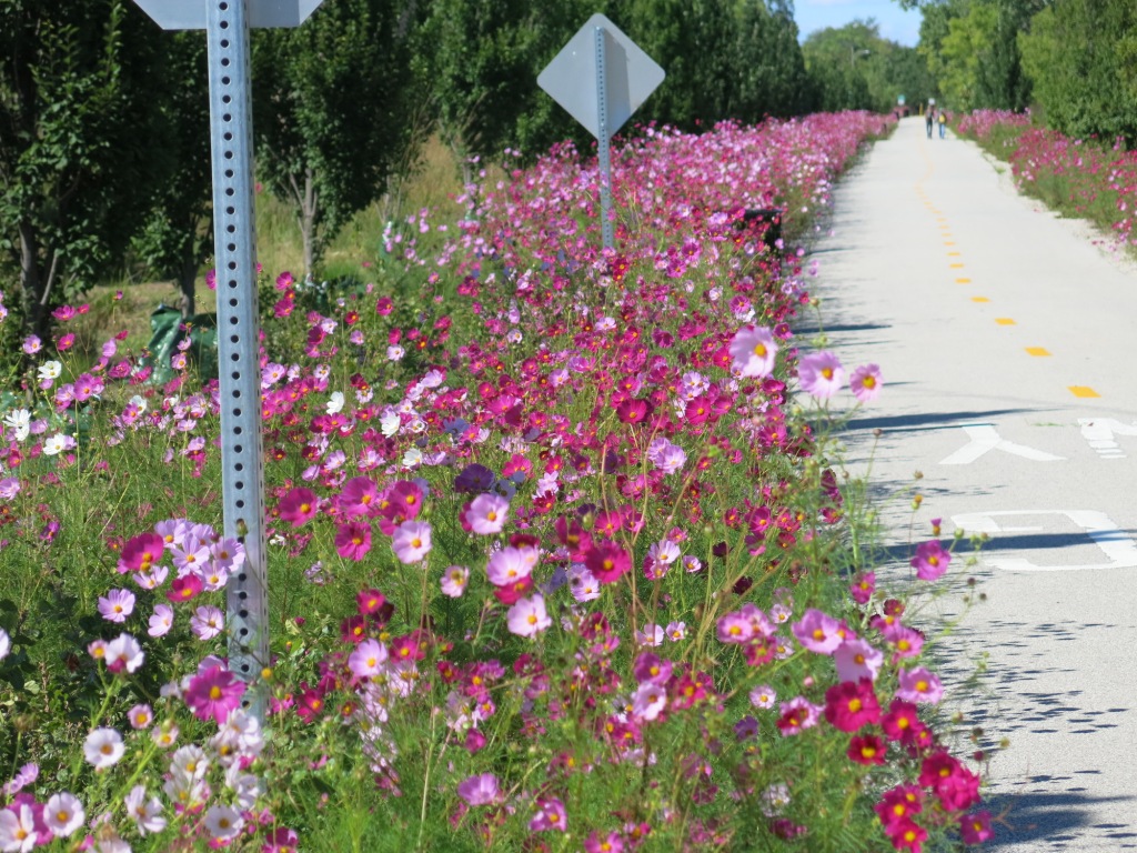 To me, this simple, inexpensive and enchanting idea is pure genius. What better way to make a ribbon of asphalt cheery and attractive? I’m hoping to discover if other seasons are equally well served along this trail.