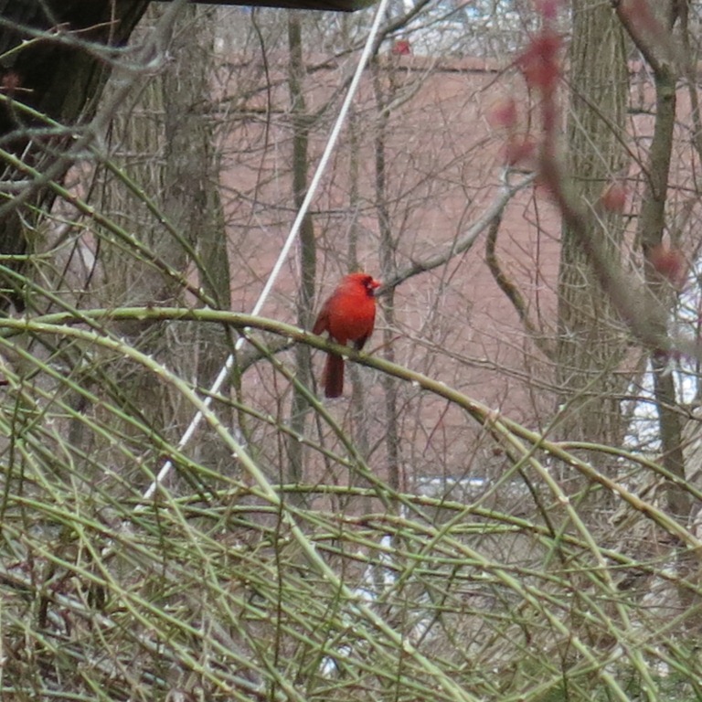 All the while, all manner of birds are making sorties to determine where they might set up their nests. I watch a pair of cardinals foraging in the meadow as though ensuring the food supply they will need once they have babies to feed. Their nest is clearly going to be amidst the brambly limbs of the Paul’s Himalayan rose that covers the very old apple tree in the meadow. This is a favorite amongst other birds as well. It seems the blue jays have elected higher quarters. I see them perched on the sugar maple.