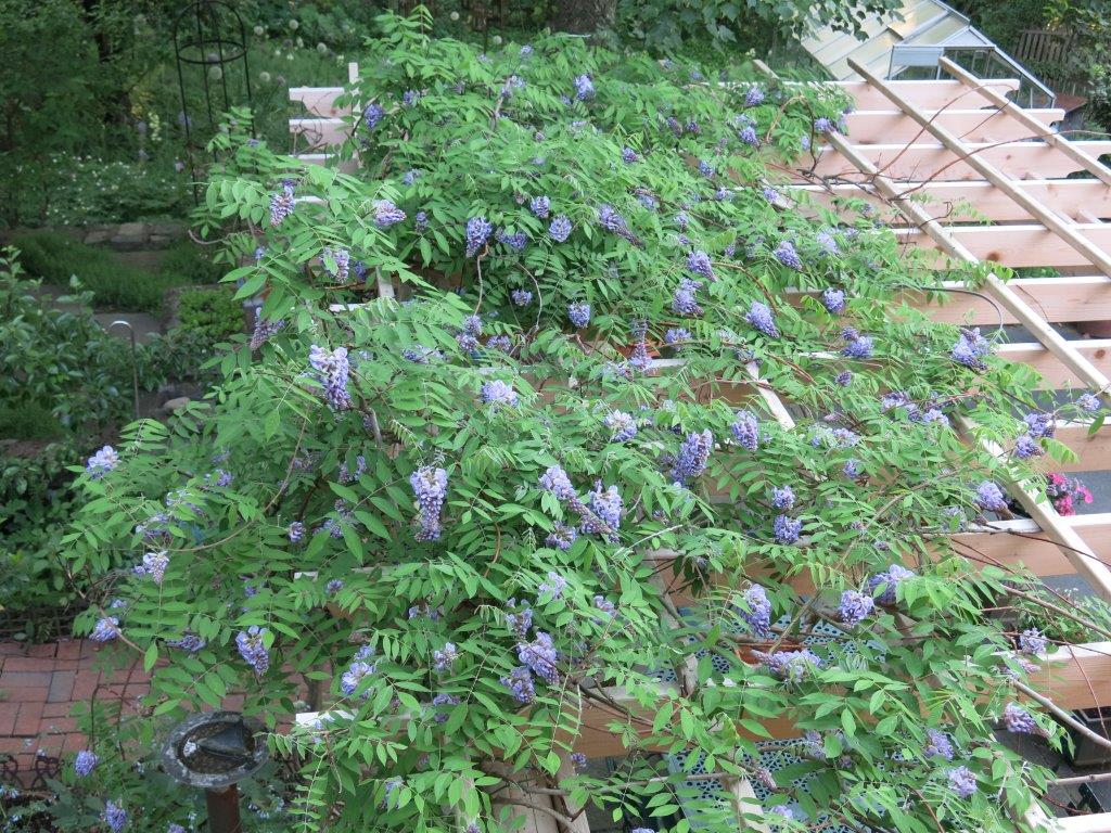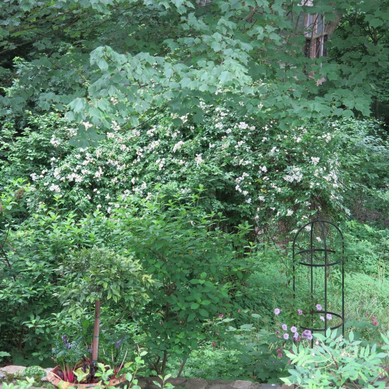 The roses have begun taking center stage. Soft shades of pink cascade on the two arbors. Like vain beauties they appear to beckon passing photographers but I’m all they’ve got. The white Paul’s Himalayan Musk roses form a spectacular canopy on the old apple tree in the meadow. The heavenly scent of this rose is lost on the myriad birds sheltering within. But the very notion of living under a bower of roses appeals enormously to my sentimental side and so I allow myself to think that my feathered friends appreciate their prime real estate. They had better because, the apple tree is now dead, its structure is on its last legs and I am trying to come up with a solution to keep this rose bedecked aviary securely held up. Something functional and tasteful. A sculpture with a purpose.