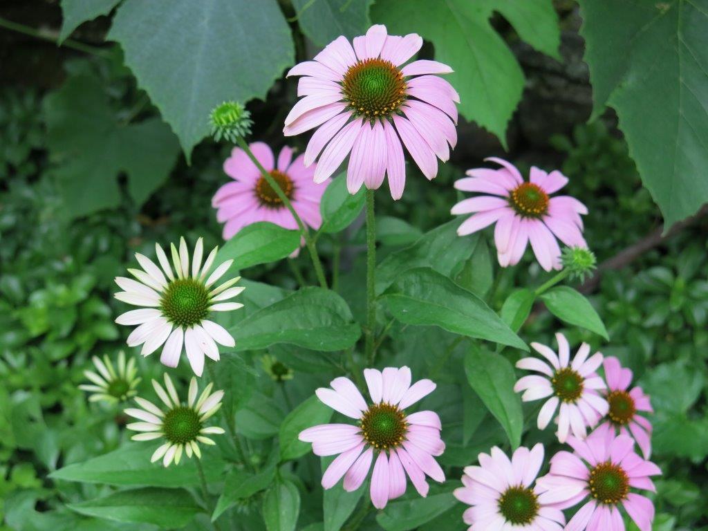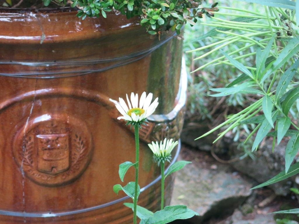 Way back at the bottom of the garden just beyond the ‘meadow’, the lone oak-leaf hydrangea is holding fort. Its white flowers are the only color against the all green in this area. The other mop-head hydrangea suffered this past winter. The old growth bearing buds for this year were destroyed. As a result there are no blooms this year. Thankfully, the plants themselves did not succumb. New growth has emerged from the base so perhaps next year I will enjoy their blue flowers. But here is an example of how the native (oak-leaf) plant does better than the non-native.