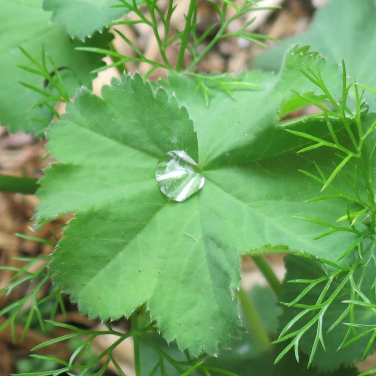 The fans of blue-green Alchemilla leaves hold beads of rain that sparkle bright in the sun. An otherwise ordinary area suddenly gets its moment to be extraordinary. I wonder if thirsty butterflies ever stop here to get a drink.