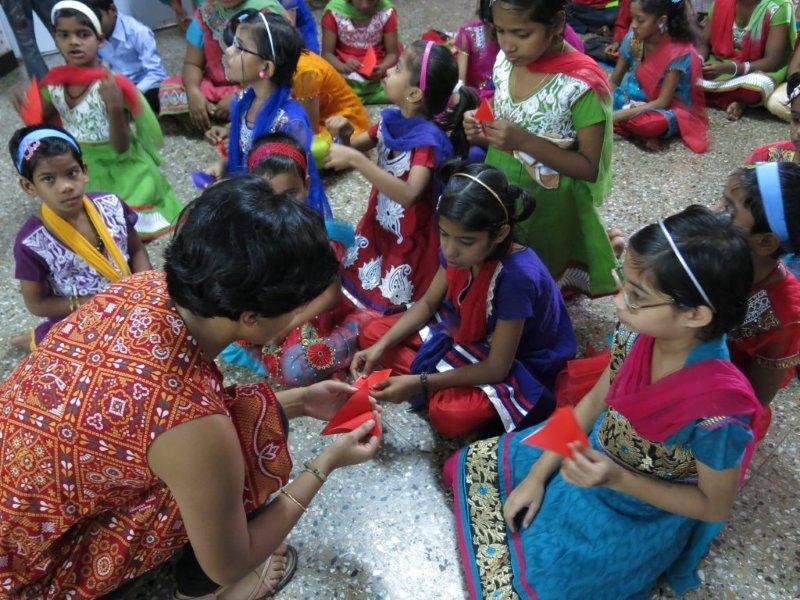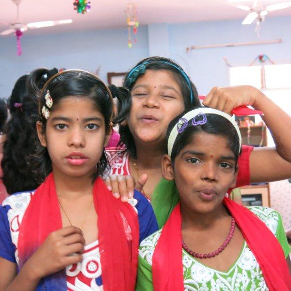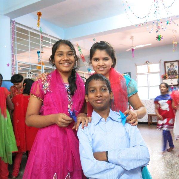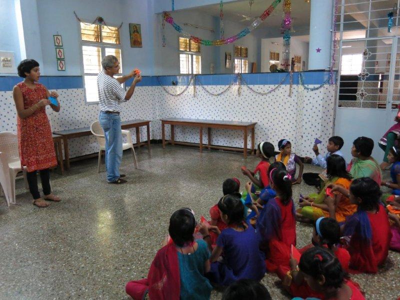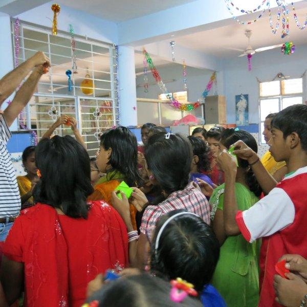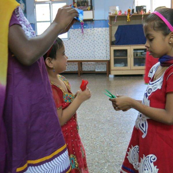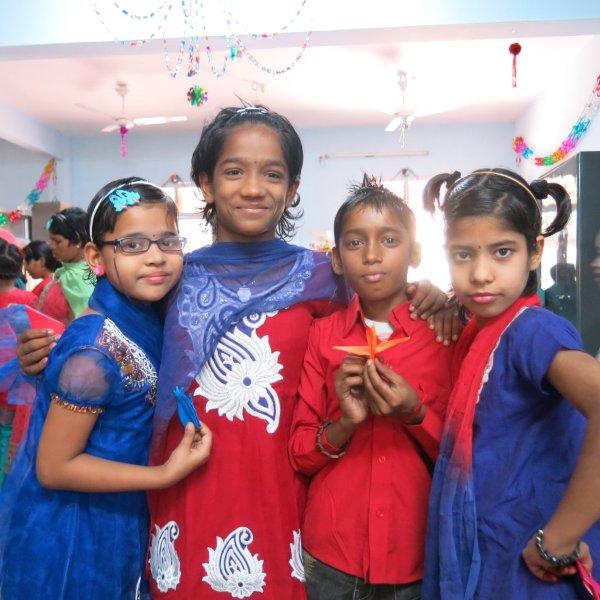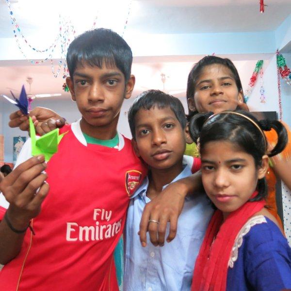 For the rest of the morning we hang out with the children. Just us three and them. No nuns or anybody else. Nice. We watch them play some games including Charades where Murali entertains all of us with his acting/gesturing, we converse a bit, share the sweet treats we’d brought and then Mira shows them how to make origami cranes. While she demonstrates, Murali interprets in Hindi so the children can follow along. I take videos and photos. The children adore having themselves photographed and keep making requests. I am all too happy to oblige – between my visits, back at home, I am given to frequently poring over their photos. Never fails to lift my spirits and put my life in perspective.